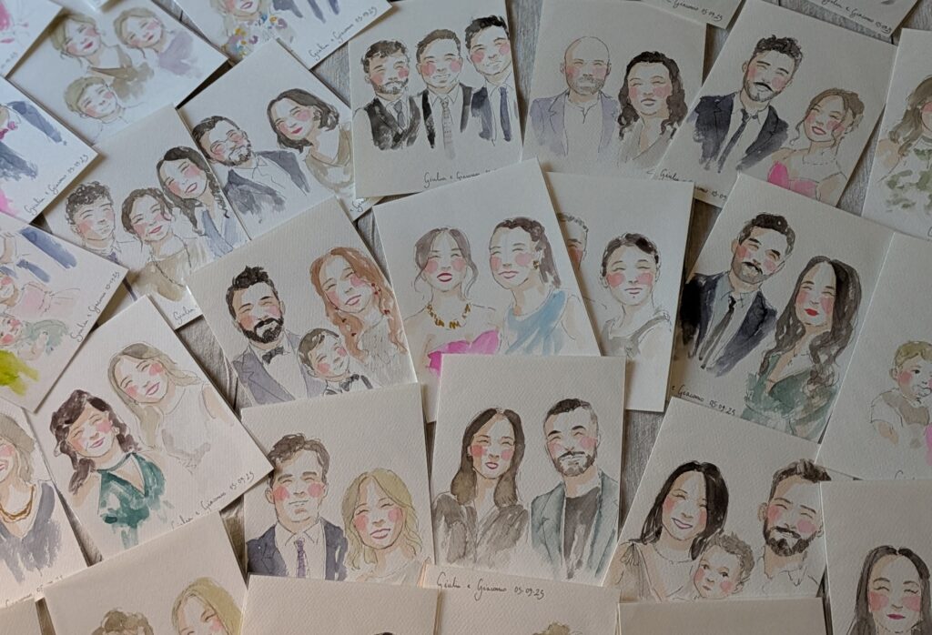 Nel corso del ricevimento ritrarrò i vostri invitati su cartoncini 5X7” di alta qualità utilizzando acquerelli, matite, inchiostri. Al termine dell’evento potranno così portarli a casa come ricordo.